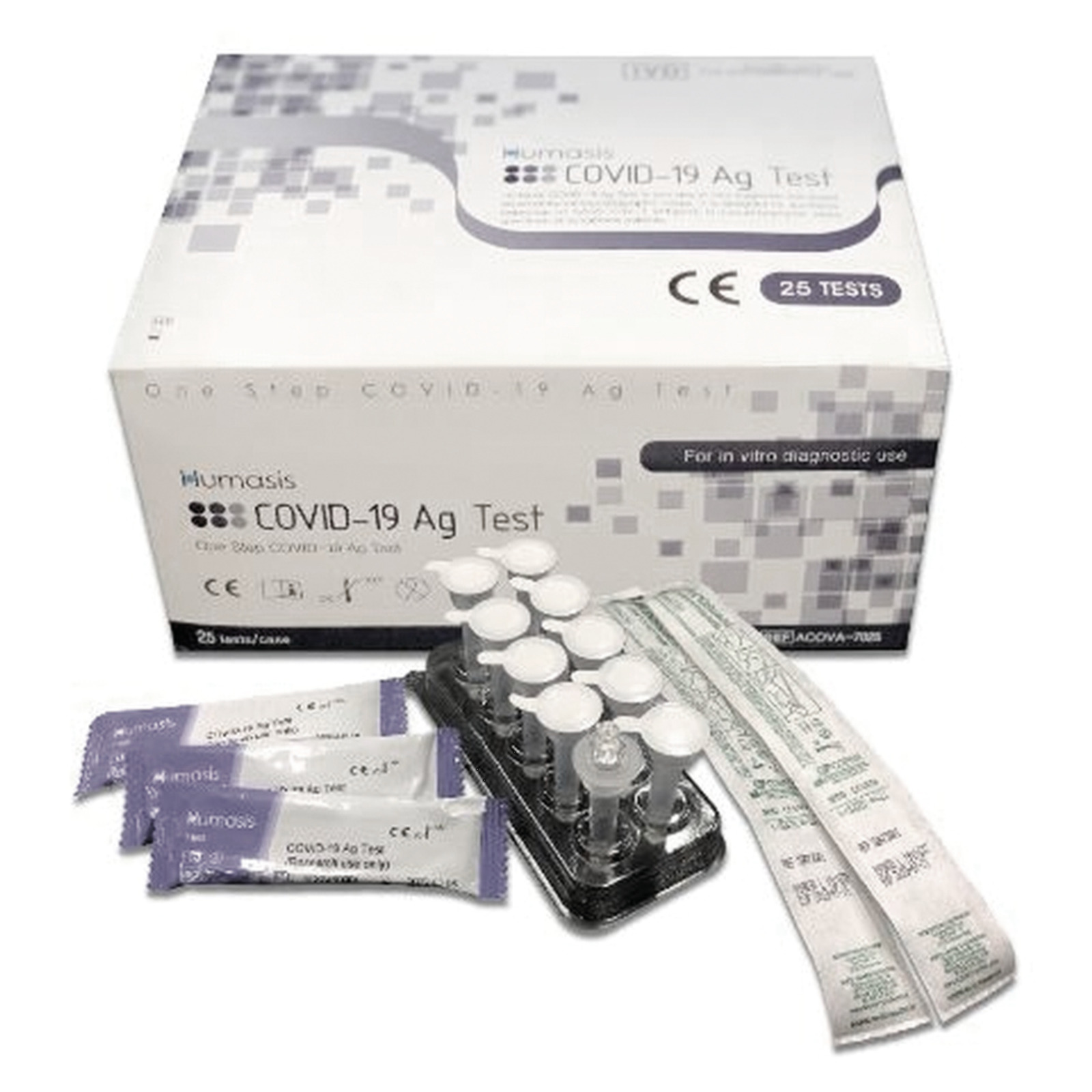 Hộp sản phẩm 25 test bao gồm: + Khay thử : 25 + Đệm chiết mẫu: 1x10ml + Que lấy mẫu vô trùng: 25 + Ống chiết mẫu có nắp nhỏ giọt: 25 + Giá đỡ ống chiết mẫu: 1 + Hướng dẫn sử dụng: 1 - Độ nhạy tương quan > 93% Độ đặc hiệu tương quan > 99% Độ chính xác tương quan: > 99%