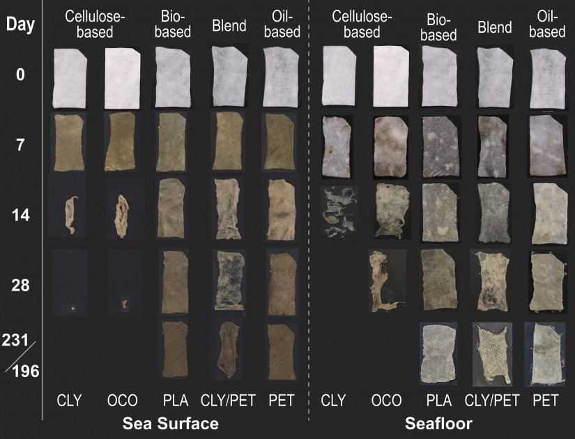Tác giả chính Sarah-Jeanne Royer đã tiến hành một thí nghiệm tại cầu Scripps Memorial và phát hiện rằng vải tự nhiên và có nguồn gốc từ gỗ phân hủy trong vòng một tháng. Ngược lại, các loại vải tổng hợp, bao gồm cả những loại nhựa "phân hủy sinh học" như axit polylactic (PLA), và phần tổng hợp của các loại vải, không có dấu hiệu phân hủy ngay cả sau hơn một năm ngâm trong biển.