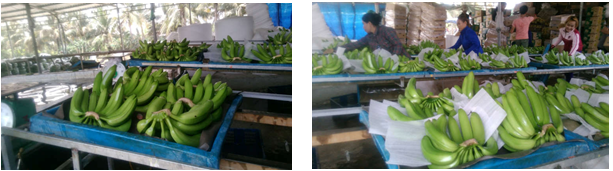 - Chuối sau khi được tách ra để trên mỗi khay cho ráo rồi mang đi đóng thùng