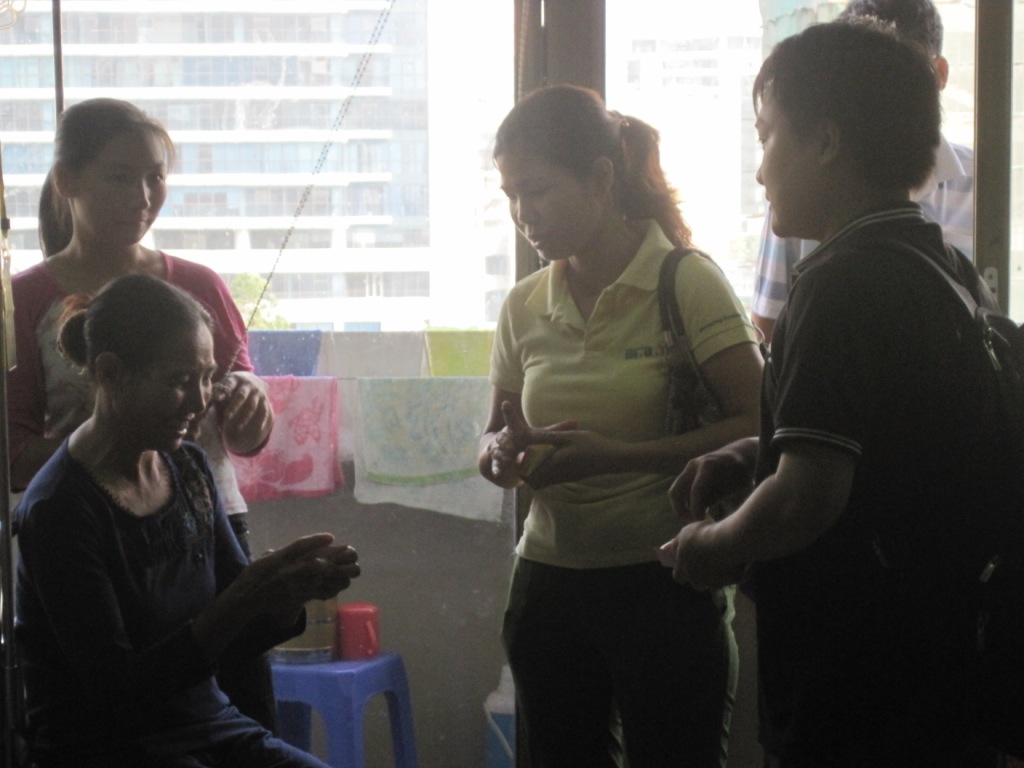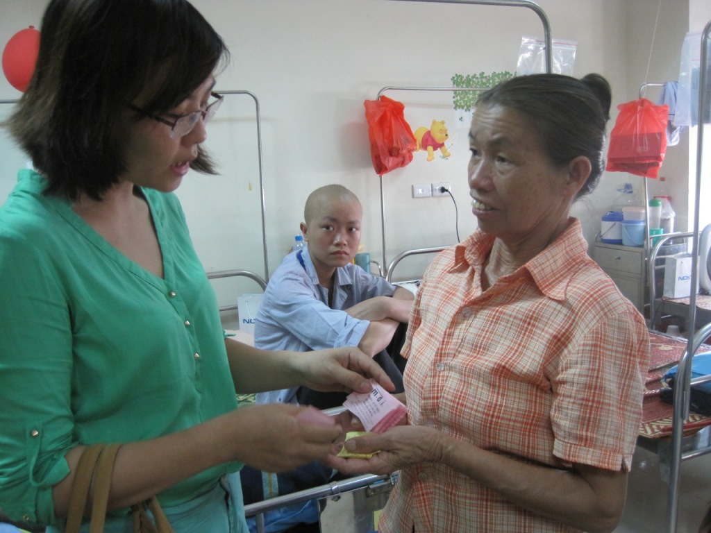 Chị Bùi Thị Dung đang trao phiếu ăn và thăm hỏi tận tình một bé ở khoa nhi